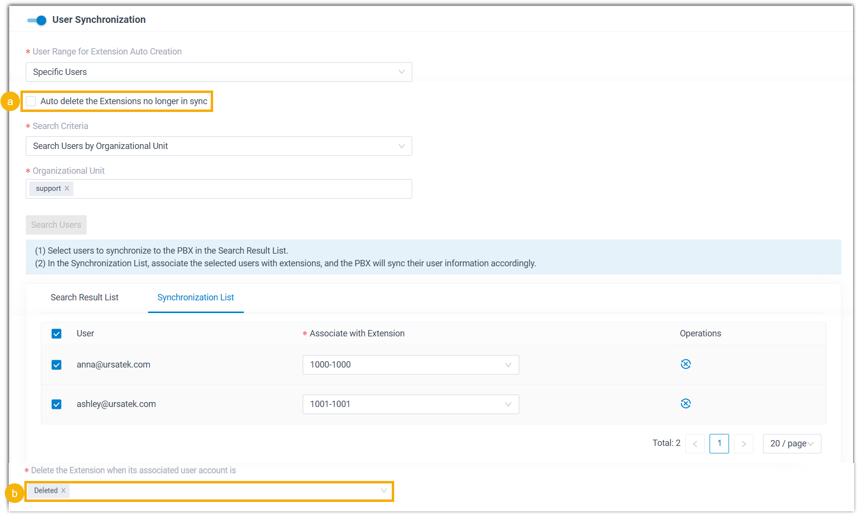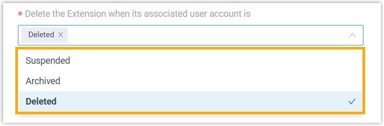- In the Delete the Extension when its associated user account is drop-down list, select the account status(es) at which PBX will stop synchronizing the users, and delete their associated extensions.