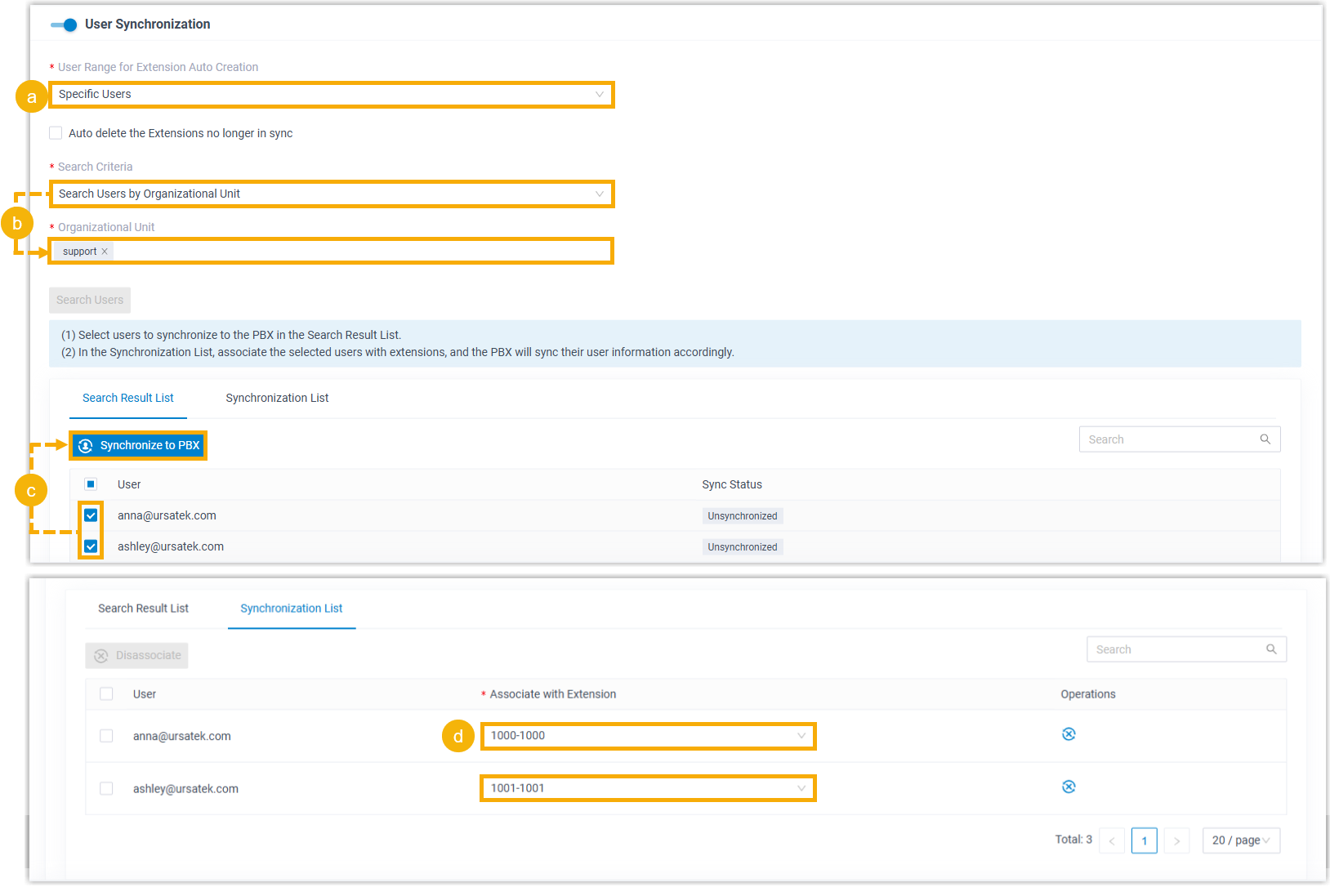 - Set the system to synchronize specific users and manually assign extensions