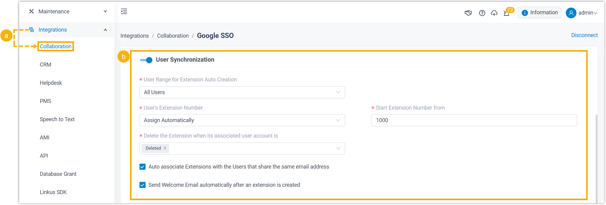 - The number of users that can be synchronized from Google Workspace depends on the number of extensions that PBX system can create.