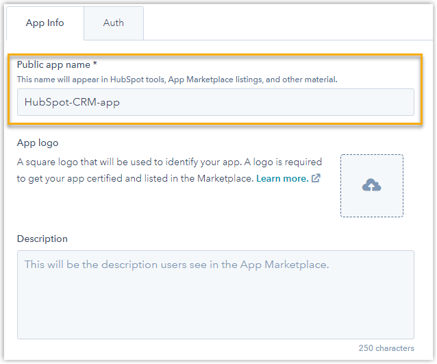 - In the Public app name field, specify an application name, which will be used wherever your application is displayed for HubSpot users.