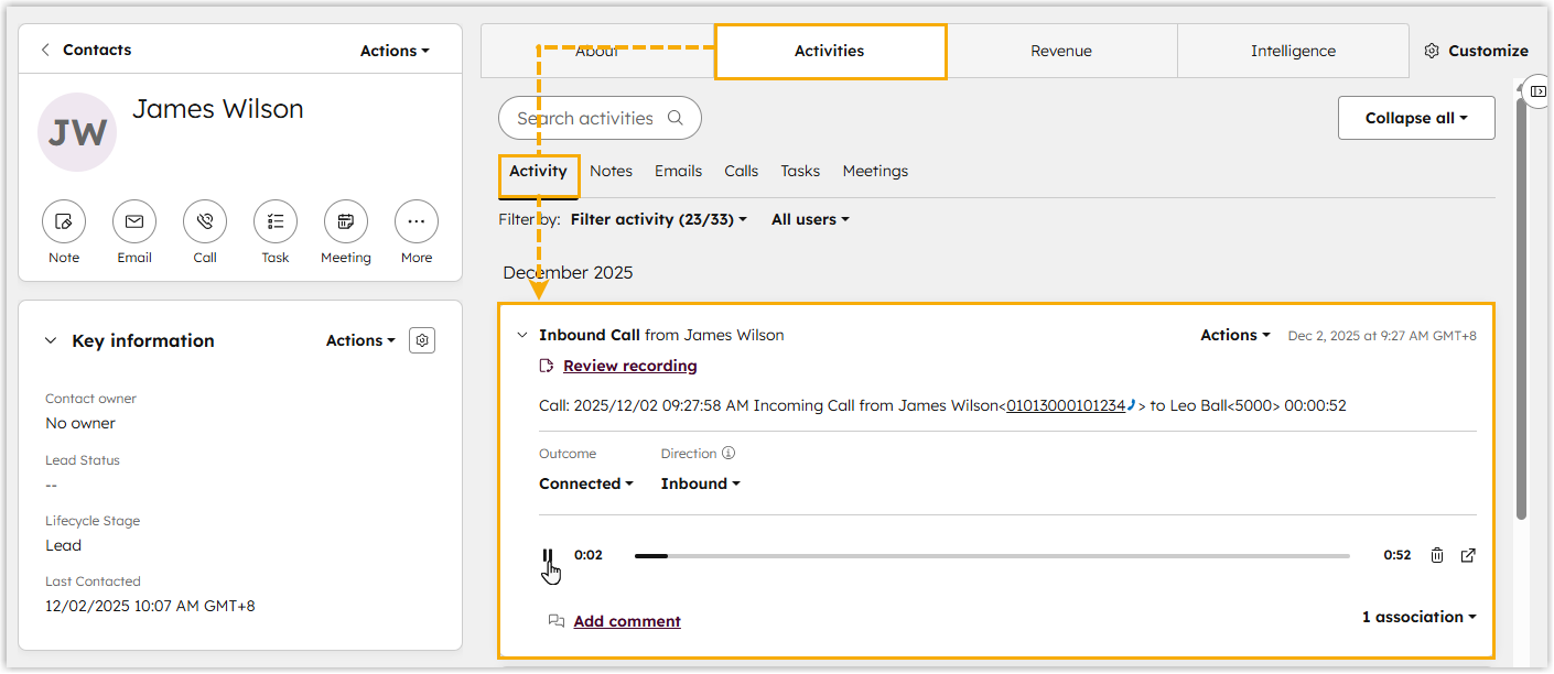 Users can log in to the HubSpot CRM, go to the Activity tab in a contact detail page to view the call logs and the corresponding call recordings.