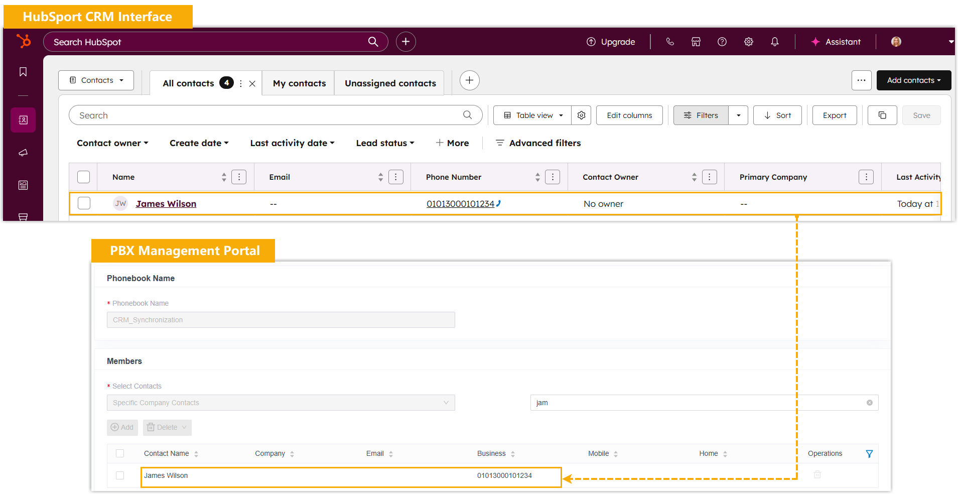 Either inbound calls from HubSpot contacts or outbound calls to the contacts will trigger a CRM contact lookup. If there exists the same number in HubSpot CRM, the matched contact will be synchronized to an associated PBX phonebook, and the synchronized contacts are read-only.