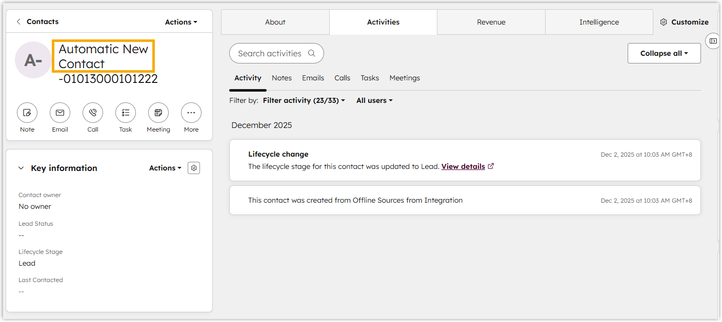 For more information, see Set up Contact Creation for HubSpot CRM.