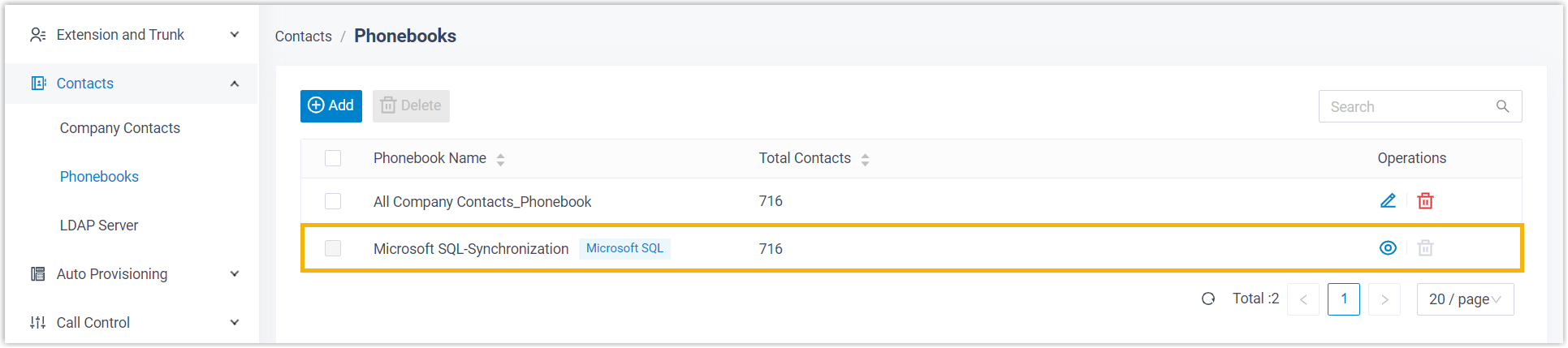 You can check the synchronized contacts and their associated phonebook(s) in , which are tagged as