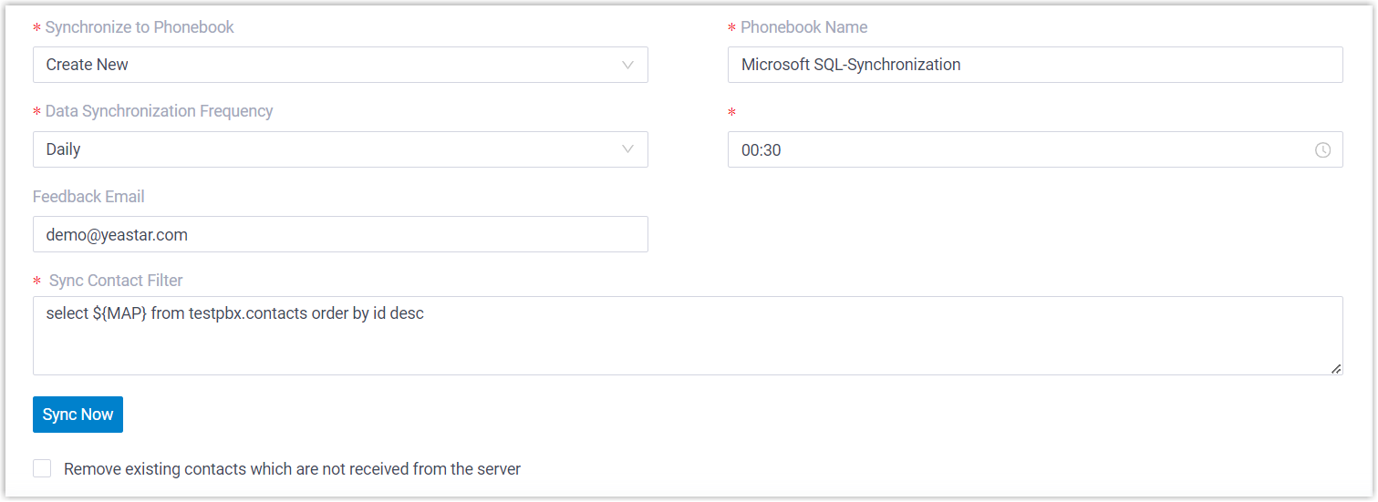 Data Synchronization Frequency Select the frequency to synchronize contacts, then configure time in the follow-up field. Note: Synchronizing a large number of contacts will affect system performance, we recommend that you schedule contact synchronization during off-peak hours.Feedback Email Optional. Enter an email address to get notified of the contact synchronization result.Note: A maximum of 5 email addresses are supported; Use a semicolon;to separate multiple addresses.Sync Contact Filter Enter a SELECT statement for contact synchronization from Microsoft SQL, in the format select ${MAP} from{schema_name}.{table_name}.Note: TOP clause is not supported.Example: select ${MAP} from testpbx.contacts order by id desc- select ${MAP}: Specify the name of the
