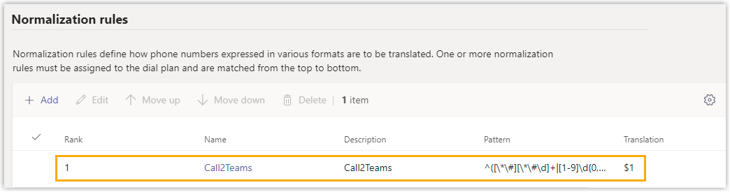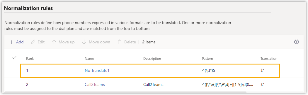 - Change the rule's priority.Note: Microsoft Teams traverses the list of normalization rules from the top down, and uses the first rule that matches the dialed number. Move the rule to the top, or users may fail to call out.