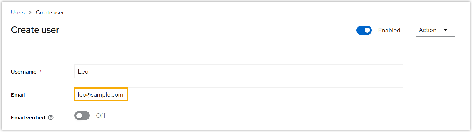 - Enter the details for the new user.Important: Since user's email address is used as the unique identifier to determine user's eligibility for Red Hat SSO, make sure the email address is properly configured.