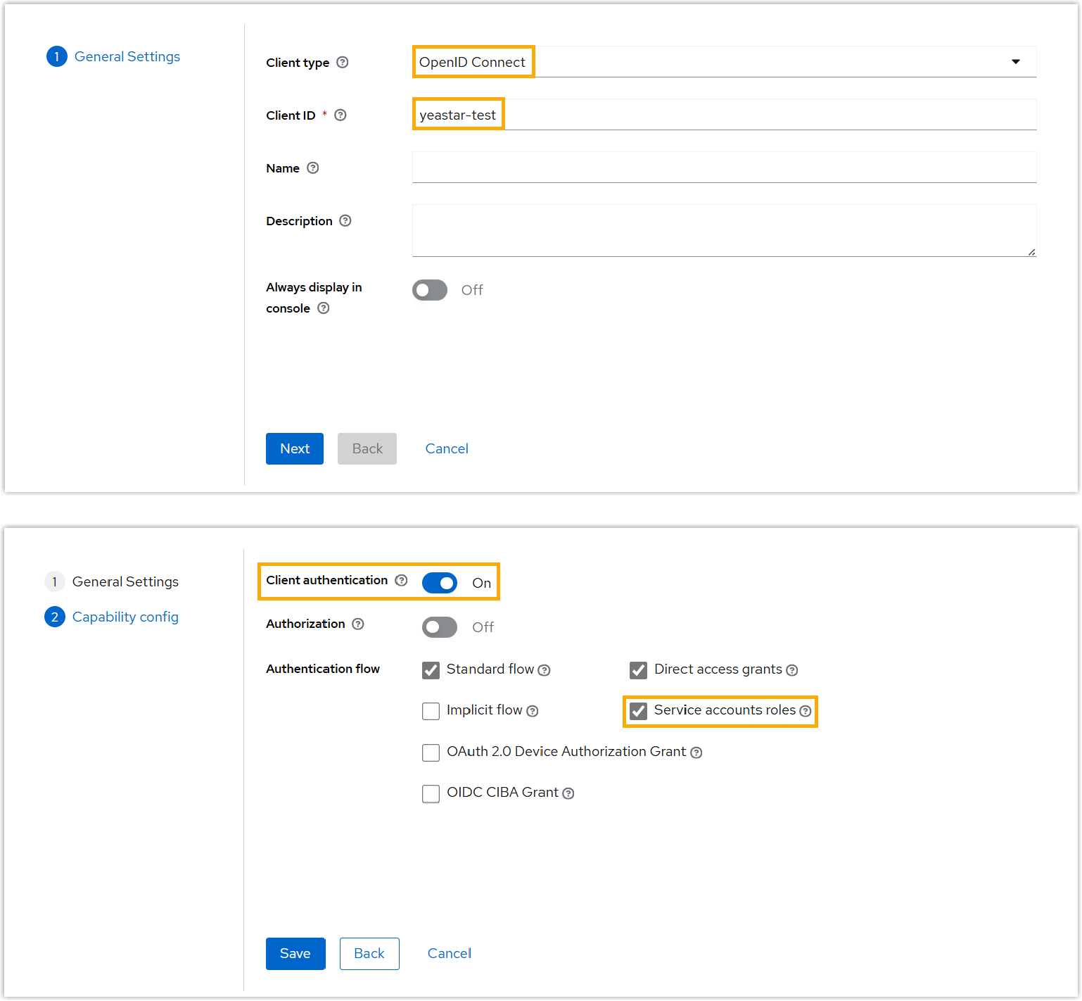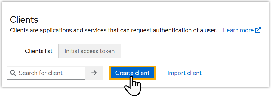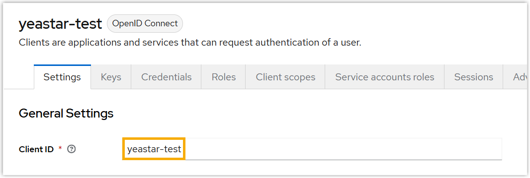 Item Description Client type Select OpenID Connect. Client ID Enter a name to help you identify the client. Client authentication Enable this option. Authentication flow Select the checkbox of Service accounts roles to authorize the client to obtain an access token.