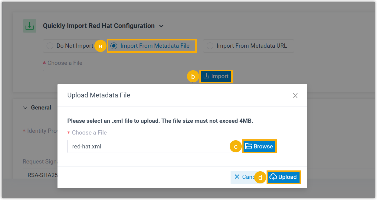 - Import Red Hat SSO configurations via metadata XML file or metadata URL.