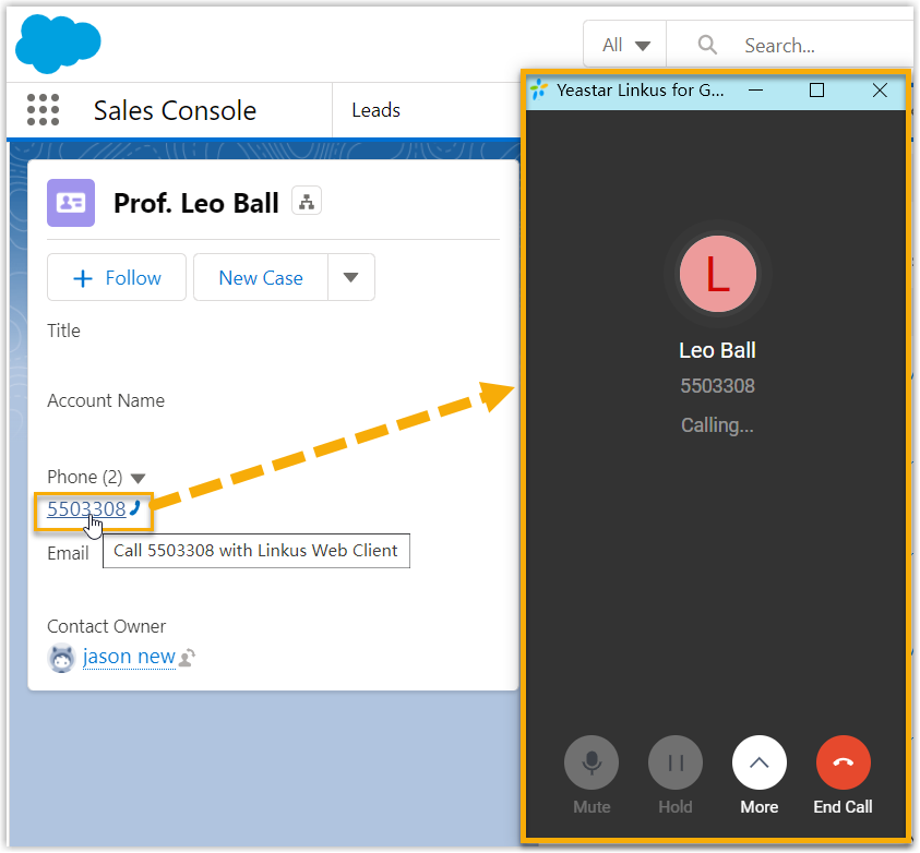 - Users can click on the detected phone numbers on the Salesforce CRM web page, a call is then sent out directly via the associated PBX extension.