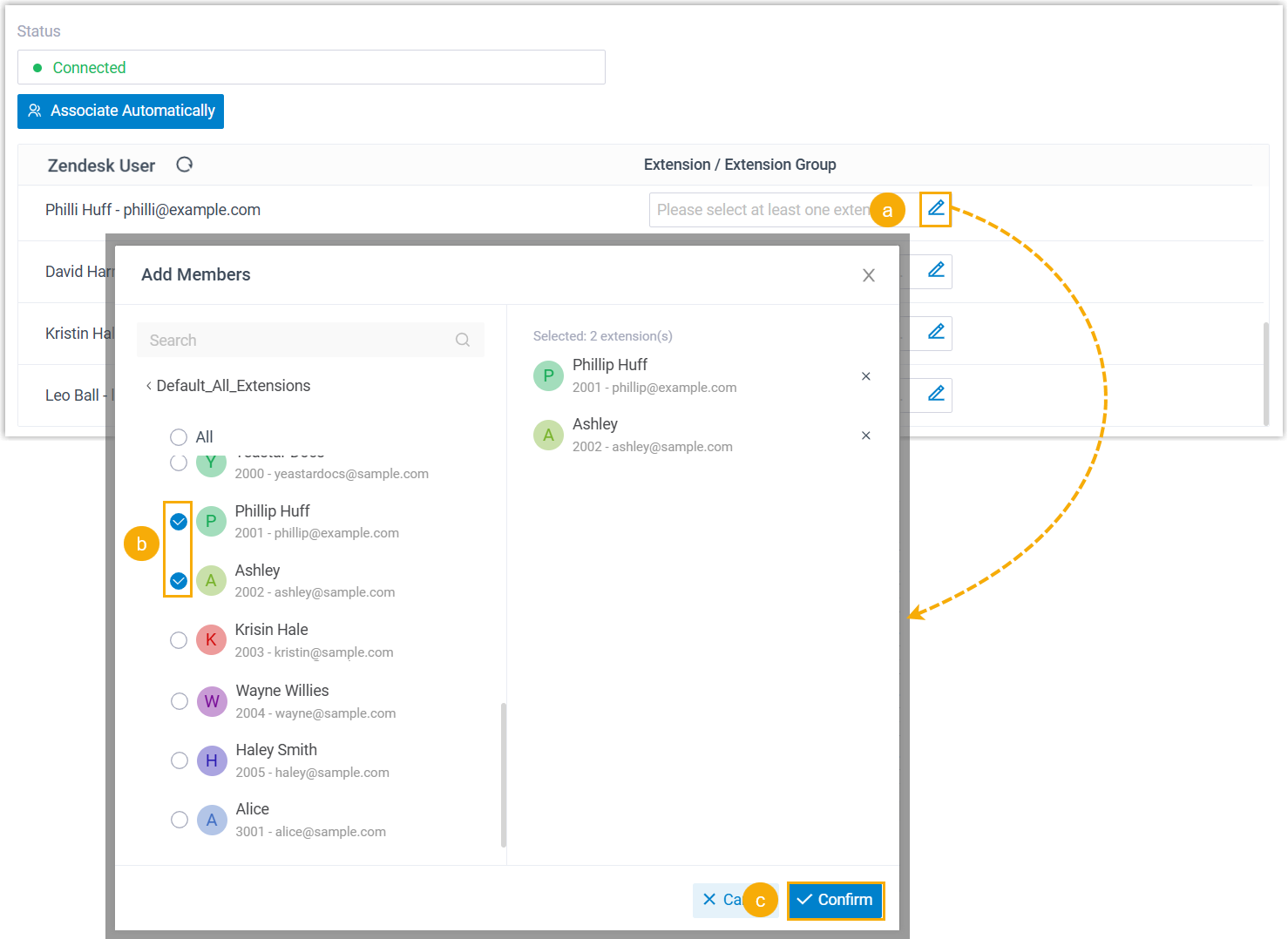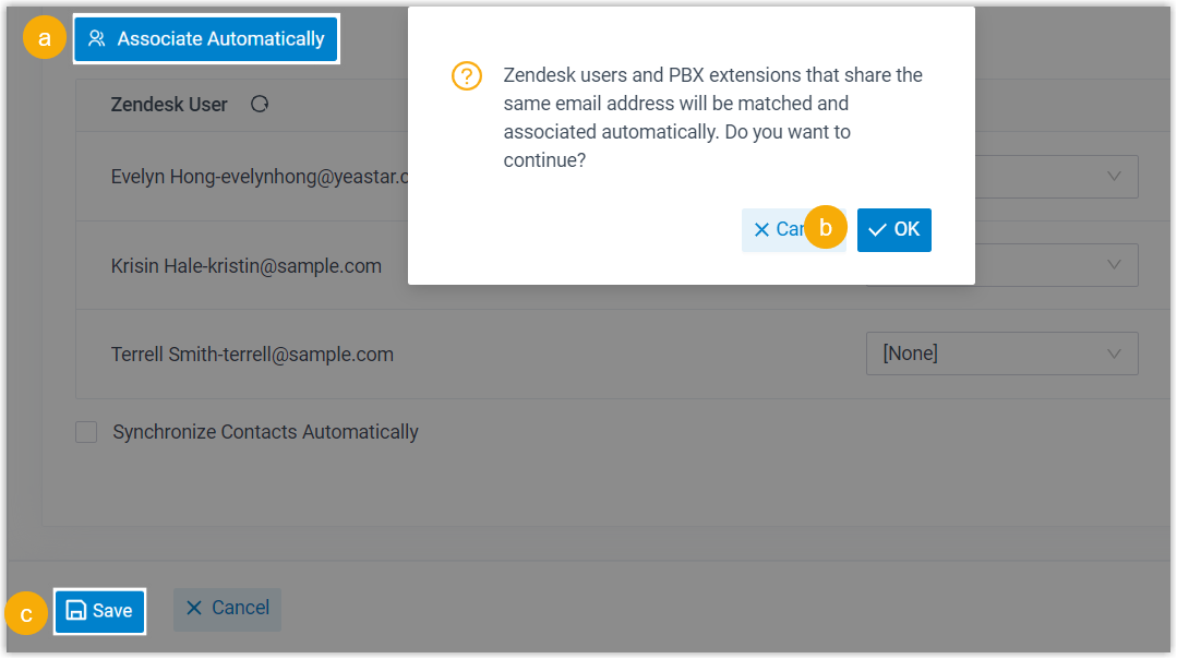 - Associated Zendesk users can make or receive calls with their PBX extensions.