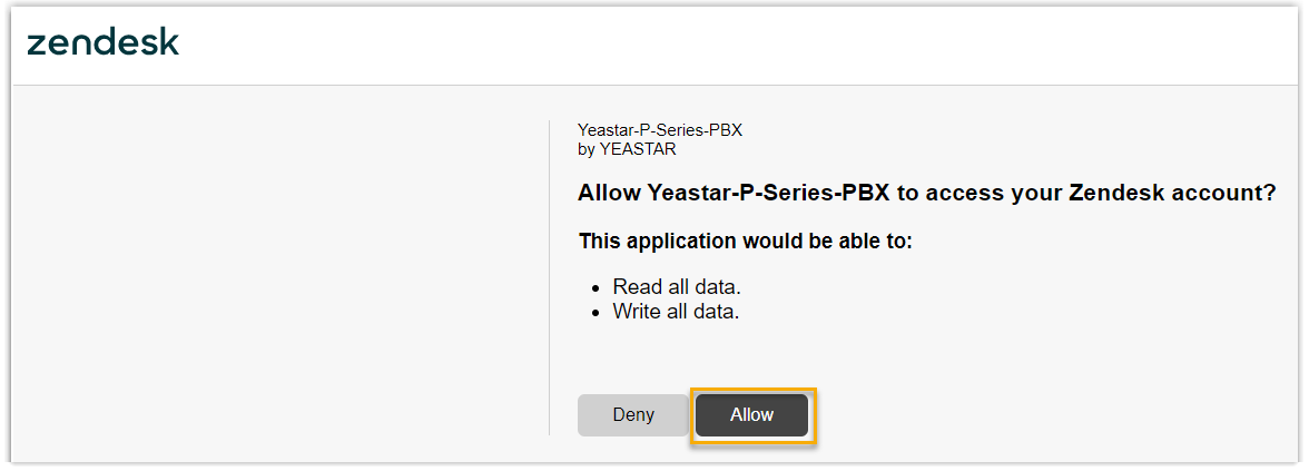 A new browser web page will be launched, indicating that the Zendesk application requests to access data in your Zendesk account.