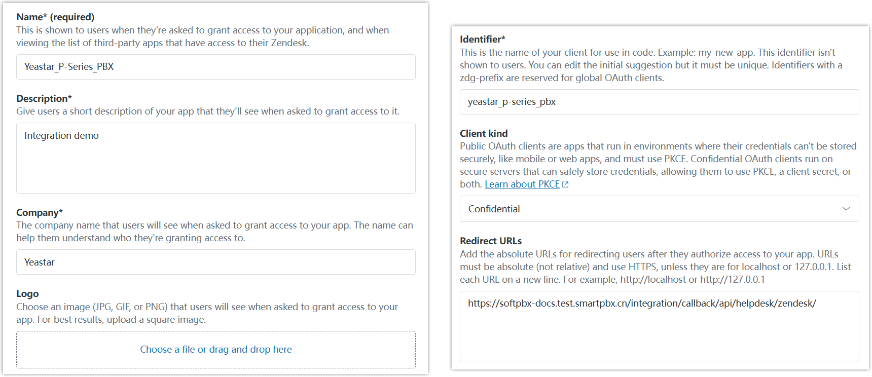 - Redirect URLs: Paste the redirect URI obtained from the PBX.