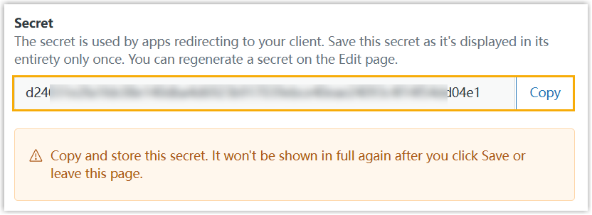 secret.Important: Make sure that you copy and properly store the secret before you leave the current web page, as the secret only displays once. Otherwise you will have to re-generate a new one.