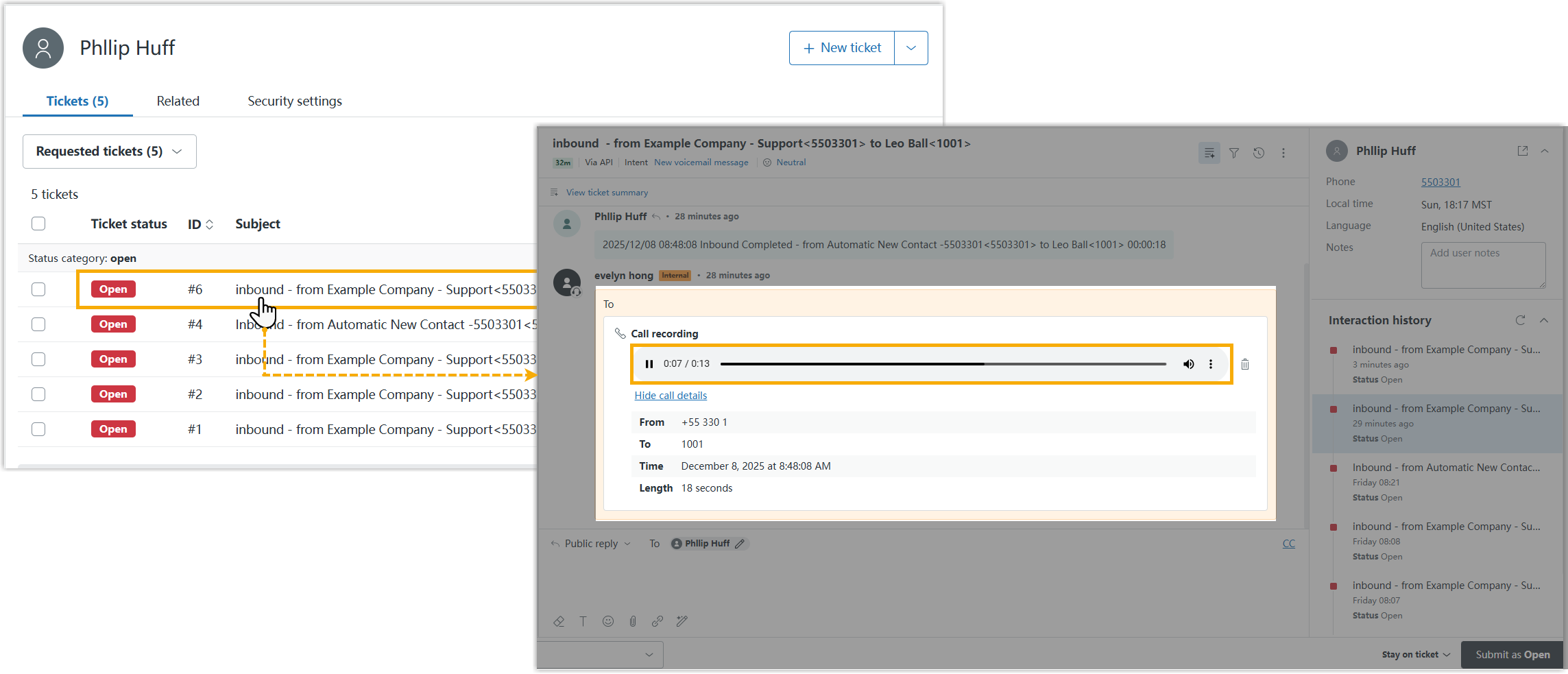 - Additionally, if you have enabled both automatic ticket creation and call recording