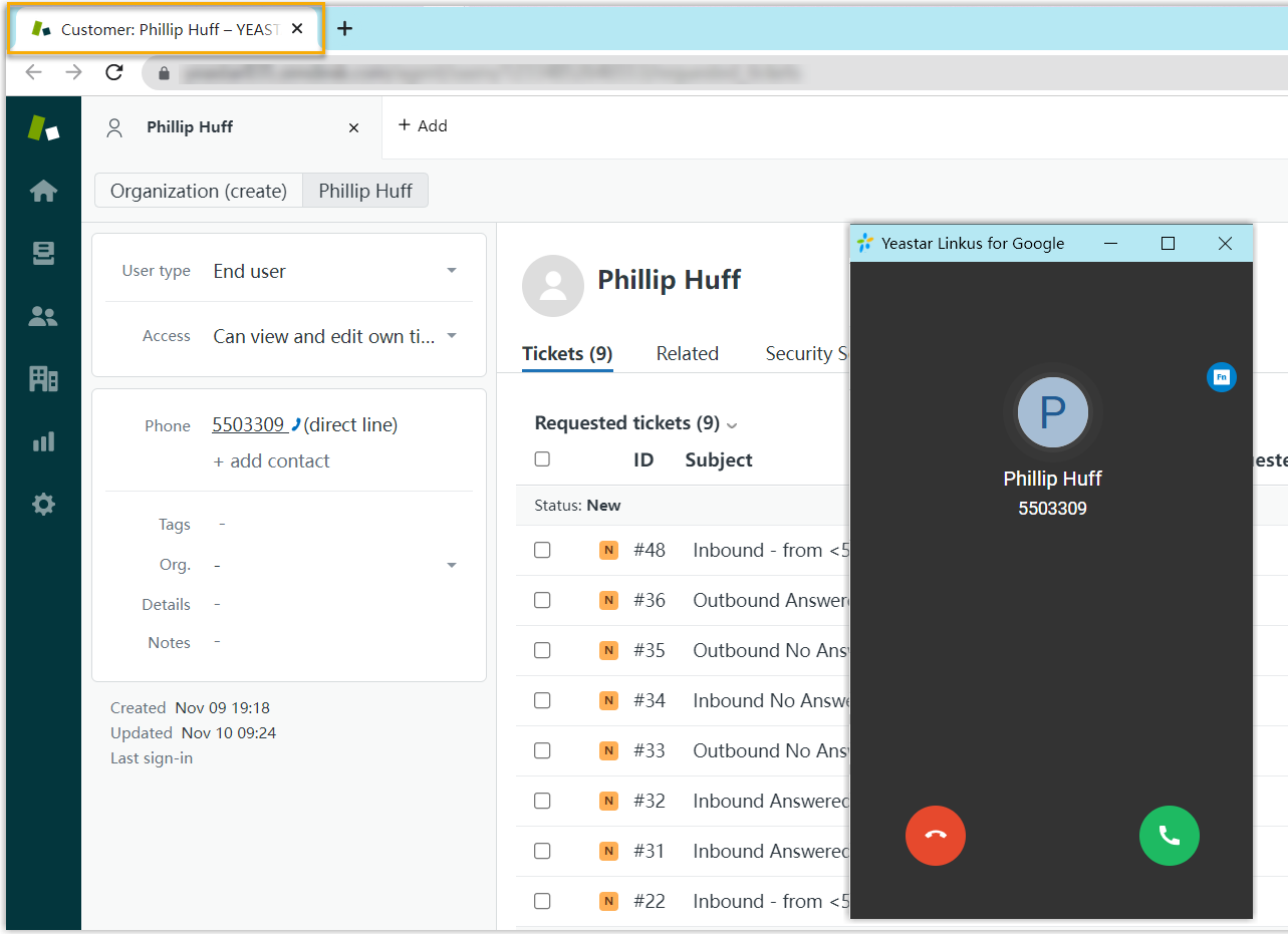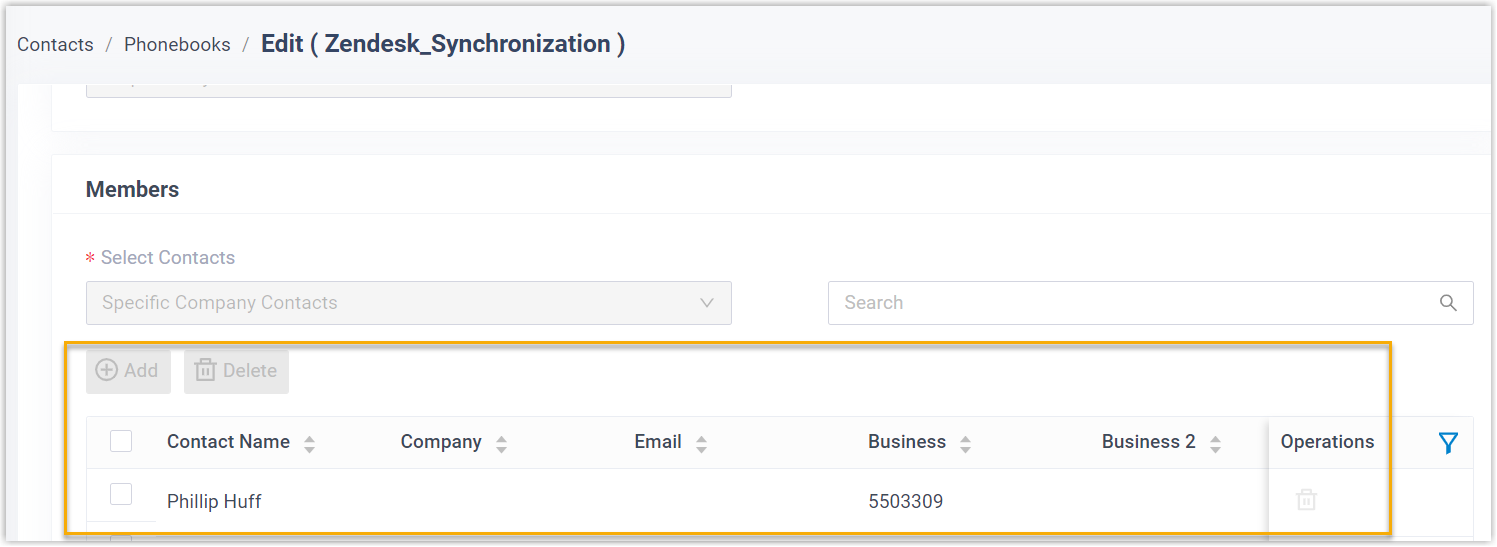 Inbound calls and outbound calls will trigger a Zendesk contact lookup. If there exists the same number in Zendesk, the matched Zendesk contact will be synchronized to the associated PBX phonebook, and the synchronized contact is read-only on PBX.