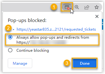 Note: The pop-up window might be blocked by the browser. In this case, users need to click on the blocked icon at the search bar, allow the pop-up window and website redirection, and then click Done.