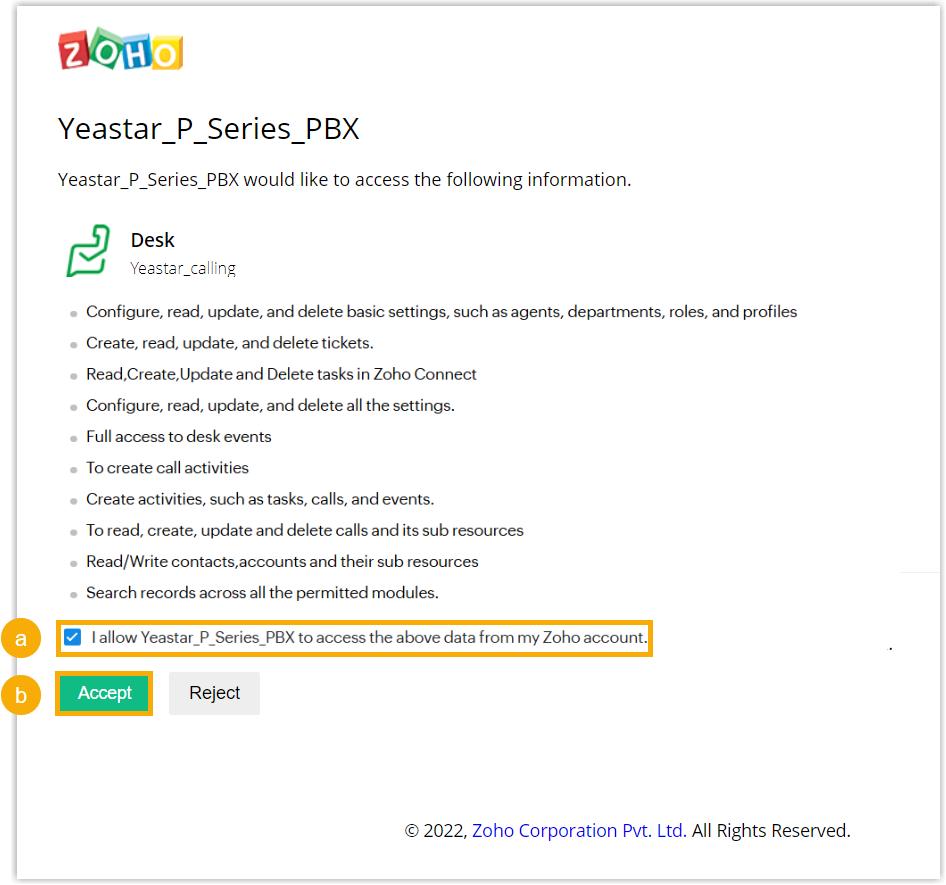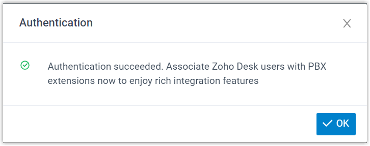 - The associated Zoho Desk users can make or receive calls with their PBX extensions.