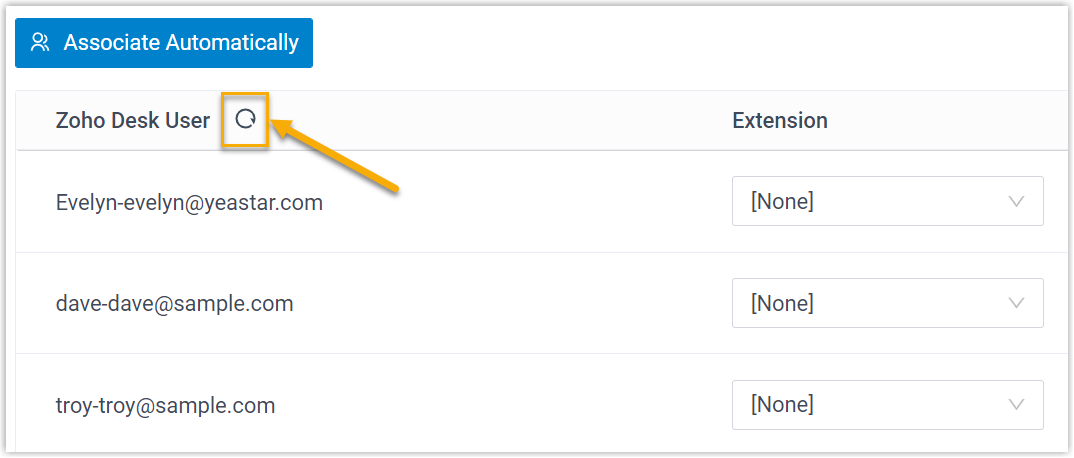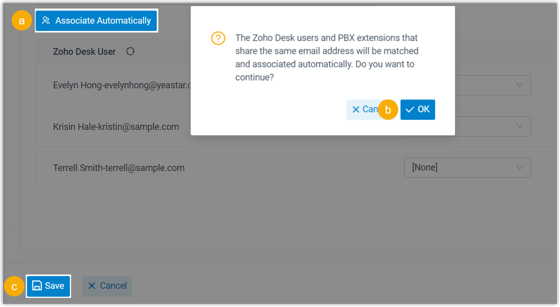 - If users bind the same email address to their Zoho accounts and PBX extensions, you can implement automatic association of their Zoho accounts and PBX extensions.