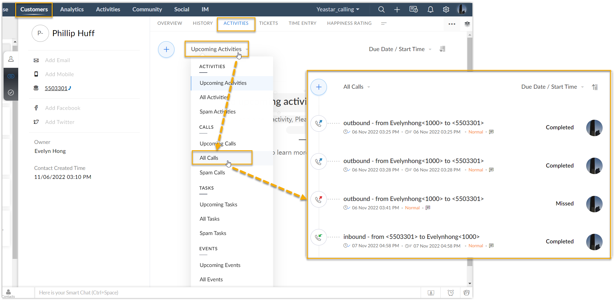 Users can check the call logs in the Zoho Desk contact's detail page on .