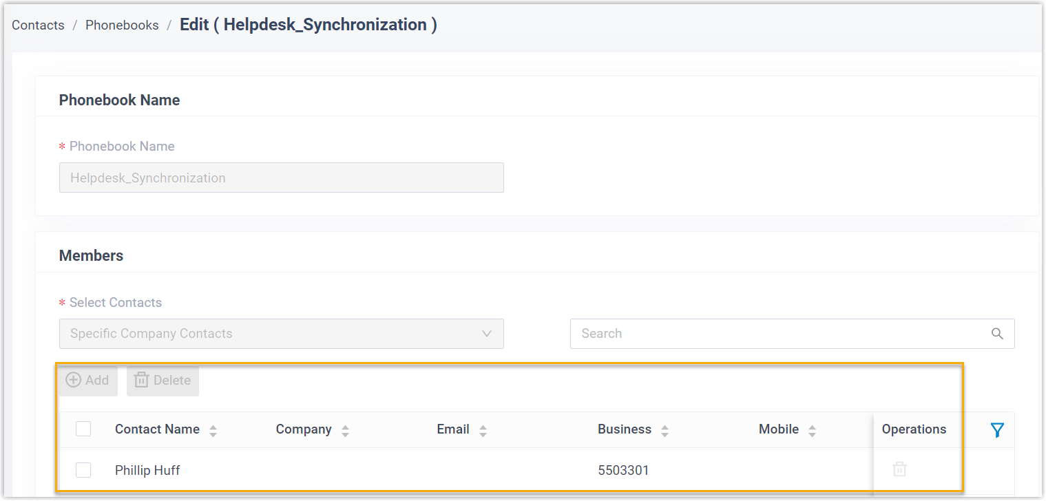Inbound calls and outbound calls will trigger a Zoho Desk contact lookup. If there exists the same number in Zoho Desk, the matched Zoho Desk contact will be synchronized to the associated PBX phonebook, and the synchronized contact is read-only.