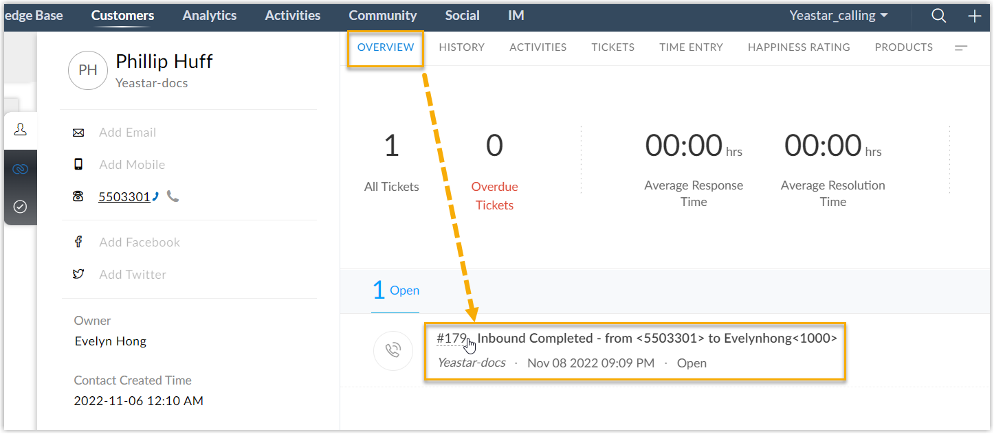 When the extension associated with a Zoho Desk user receives an inbound call from, or places an outbound call to a Zoho Desk contact, a new ticket will be created automatically in the contact's details page.