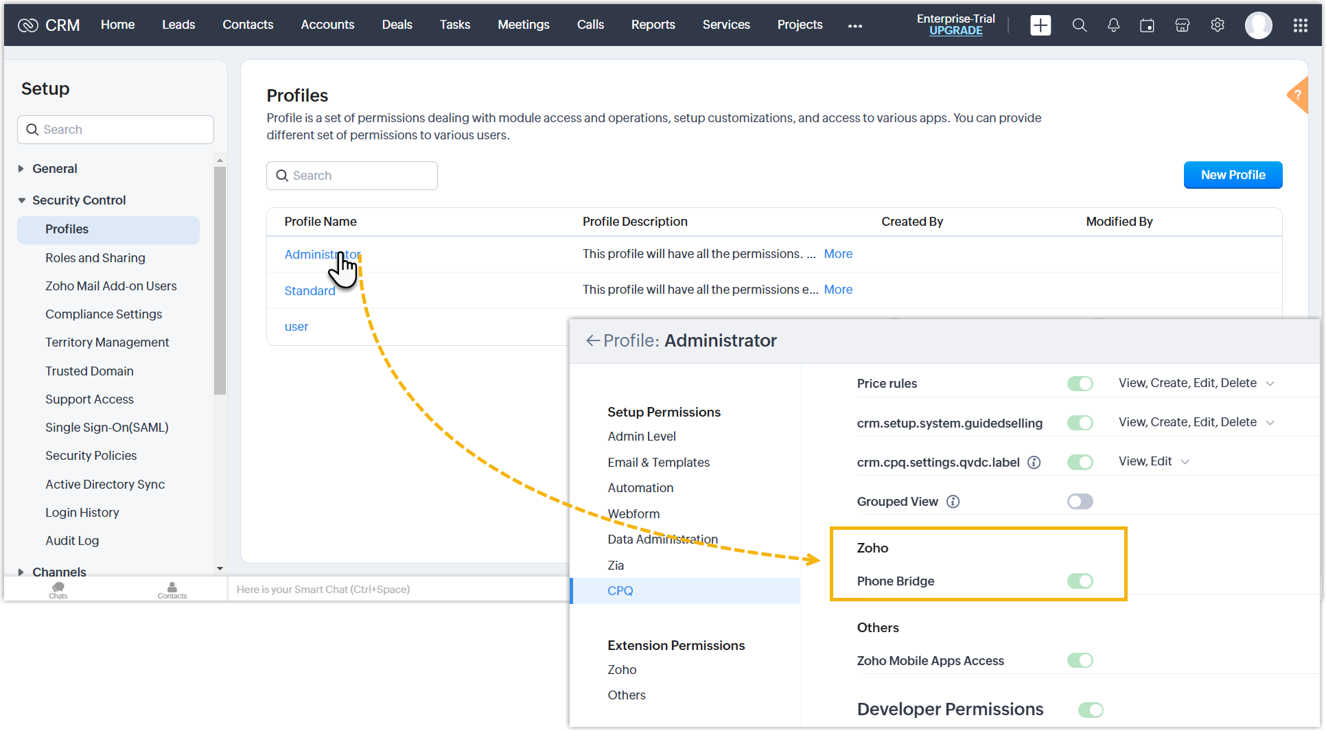 Note: Only activated users with permission for Zoho PhoneBridge can be associated with PBX. You can go to to view or edit profile permissions as needed.