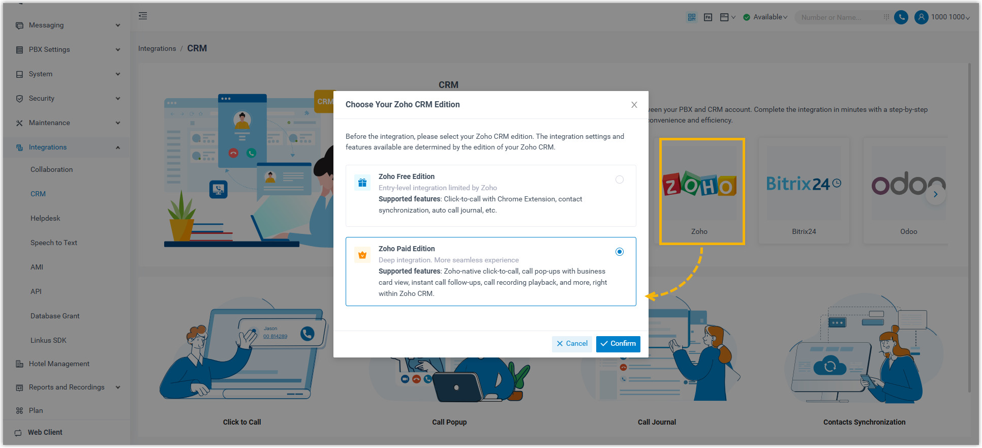 Log in to PBX web portal, go to , then select Zoho Paid Edition.