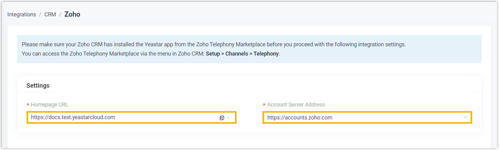 - The integration of Cloud Voice and Zoho CRM is set up.