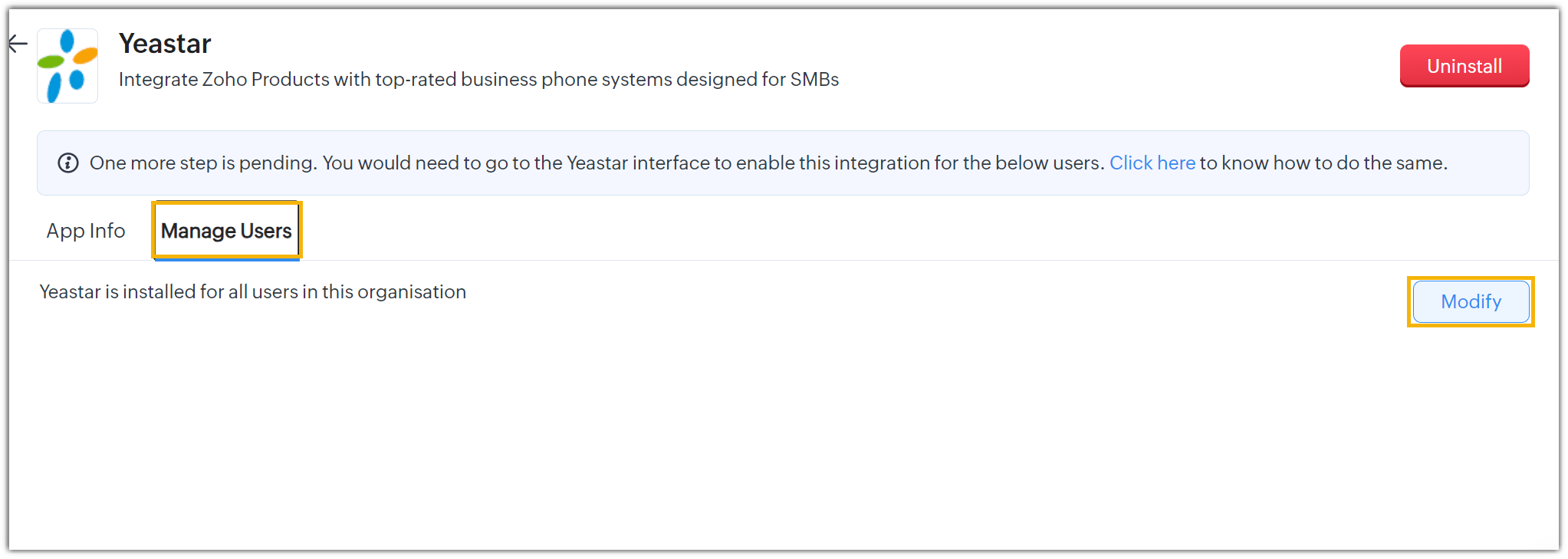 The Cloud Voice App is successfully installed.Note: If you want to change the Zoho users allowed for accessing integration features, go to the Cloud Voice App and clicking on Modify.