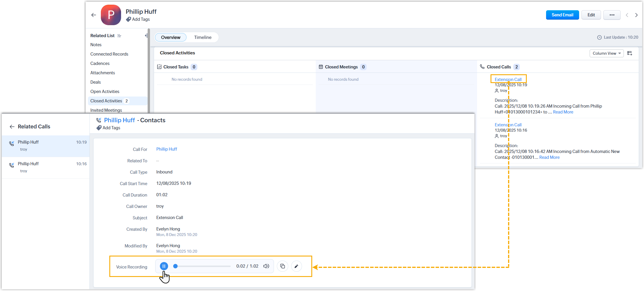 - If you have enabled the call recording playback feature, Zoho CRM users can