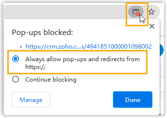 Note: The pop-up window might be blocked by the browser. In this case, users need to click on the blocked icon at the search bar, allow the pop-up window and website redirection, and then click Done.