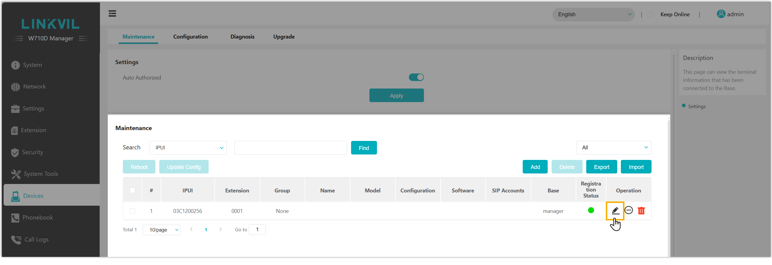 On PBX web portal, add the DECT base station, configure the provisioning settings, and assign extensions to the DECT handsets.- Log in to PBX web portal, go to .