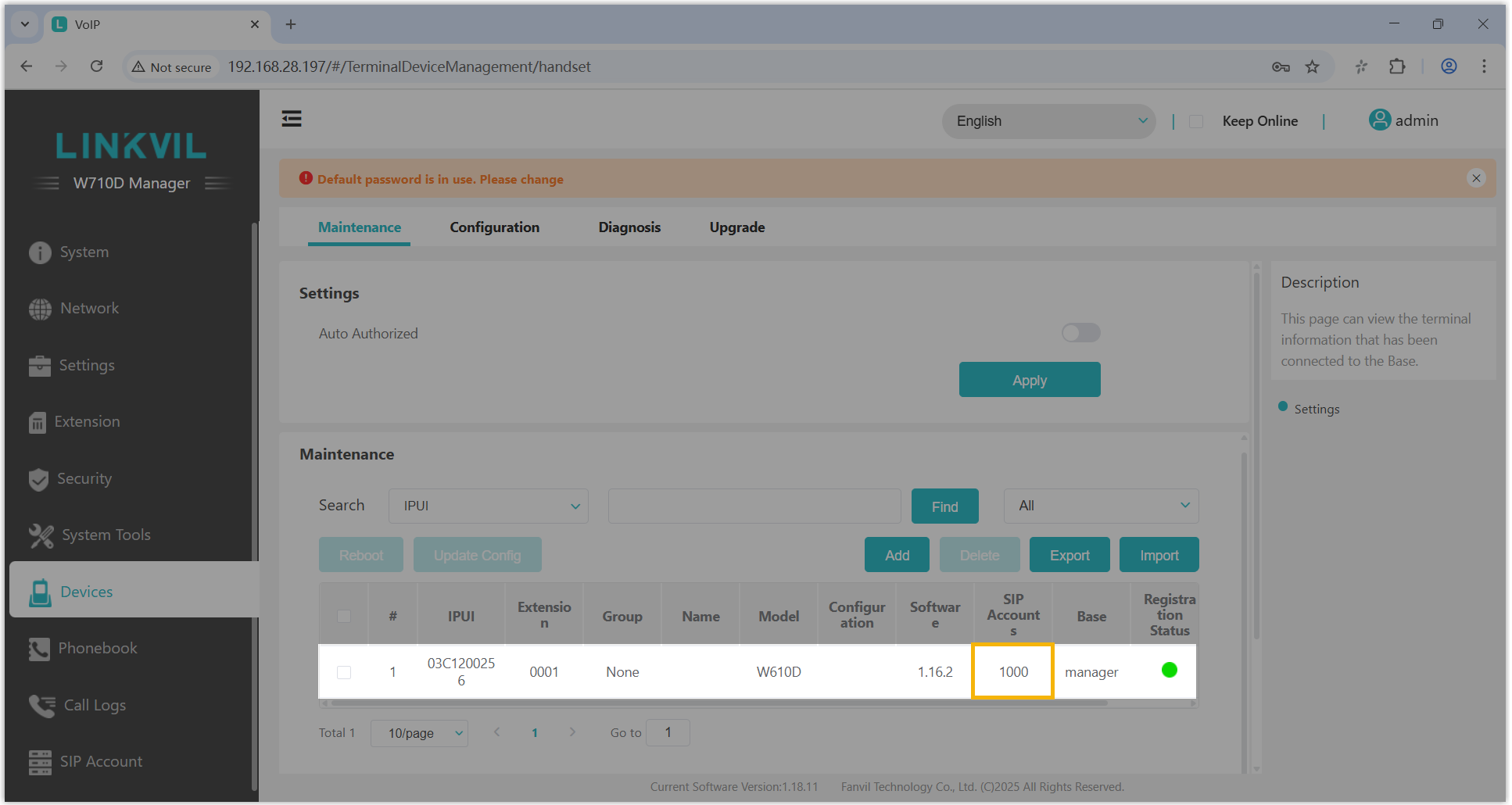 - Gather information of the Fanvil DECT base station, including Vendor, Model, and MAC address.