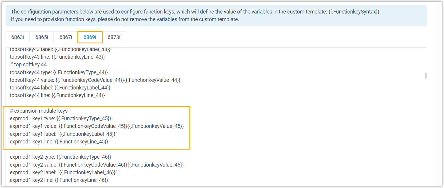 for the expansion module.Note: Function key settings that exceed the supported programmable keys of the IP phone will be automatically applied to the connected expansion module. For example, Mitel 6869i supports 44 programmable keys, then the function key settings starting from the 45th key will take effect on the expansion module.