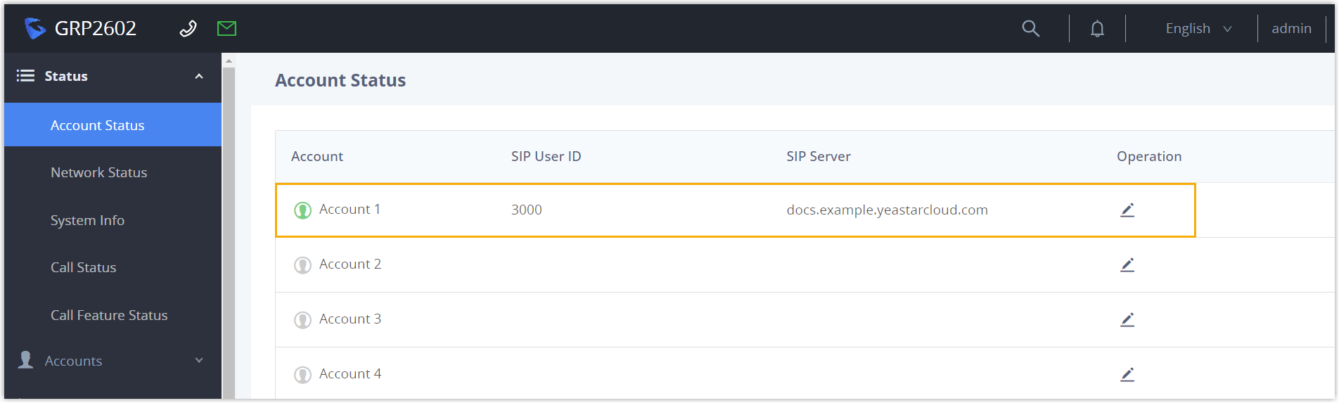 The extension is registered successfully. You can check the registration status on on the phone's web interface.