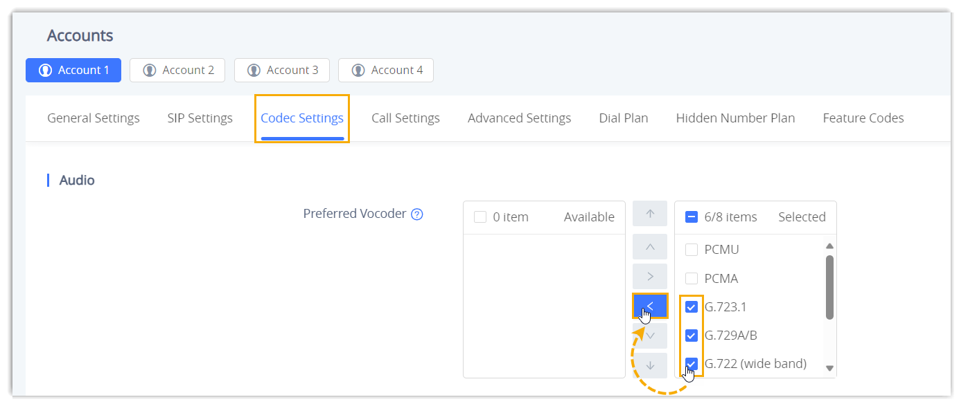 for the account.Note: By default, Grandstream IP phone enables all available codecs for its accounts, which may lead to issues with outgoing calls. Therefore, it is recommended to remove unnecessary codecs for the account that has been registered with the PBX extension.