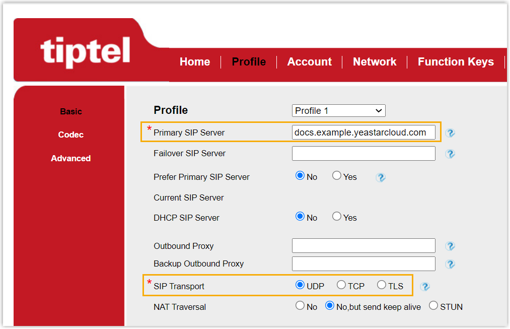 - Primary SIP Server: Enter the domain name of the PBX.