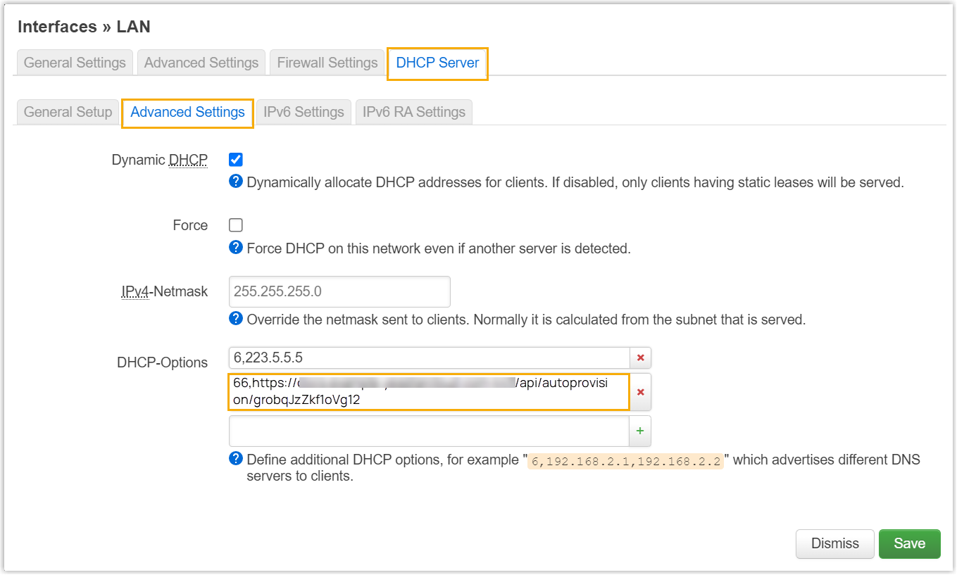 In the subnet where the IP phone is deployed, use the generated provisioning link to configure option 66 on the DHCP Server.