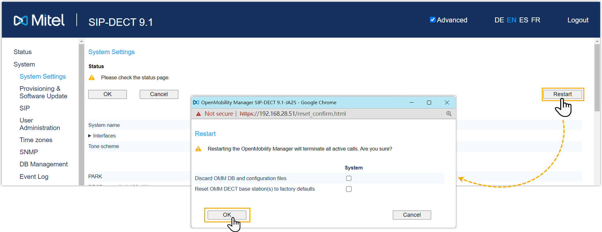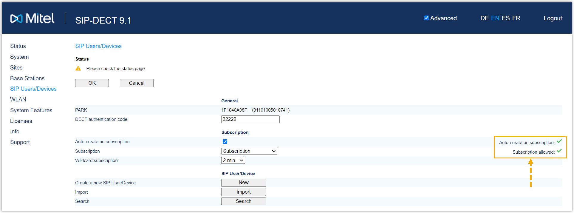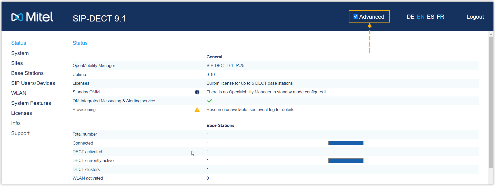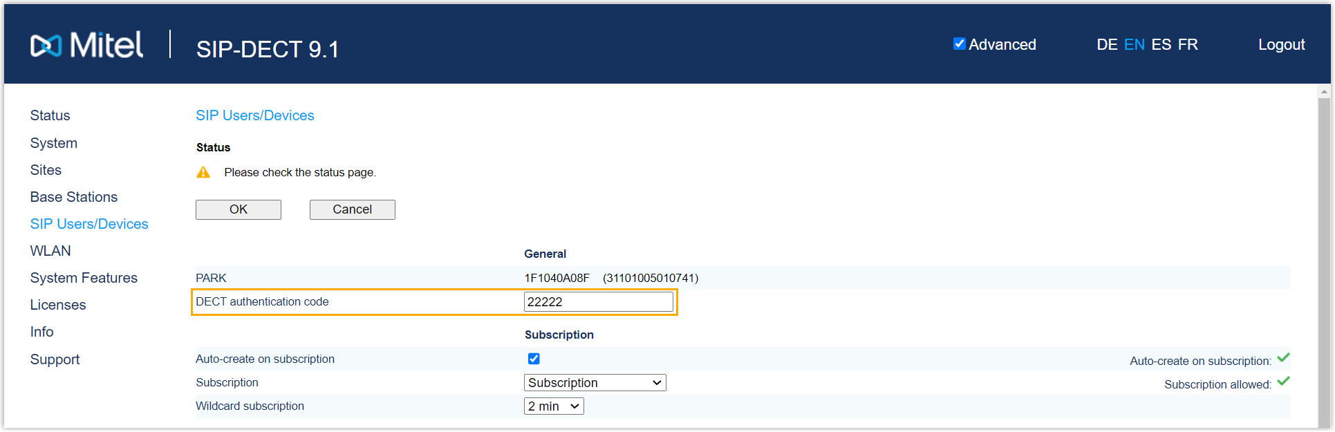- Log in to the web interface of the Mitel DECT base station.