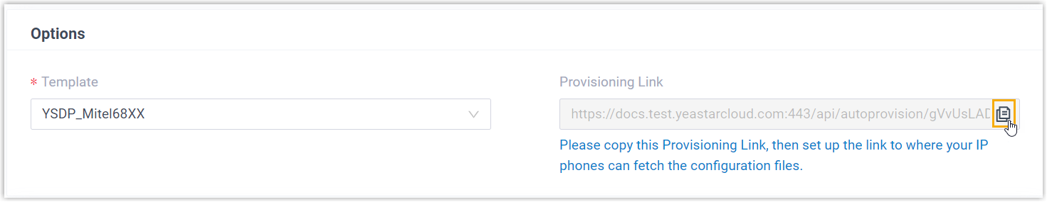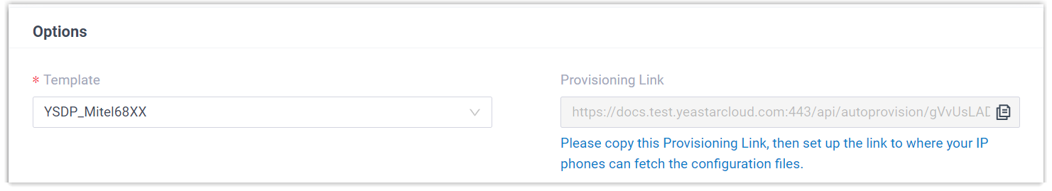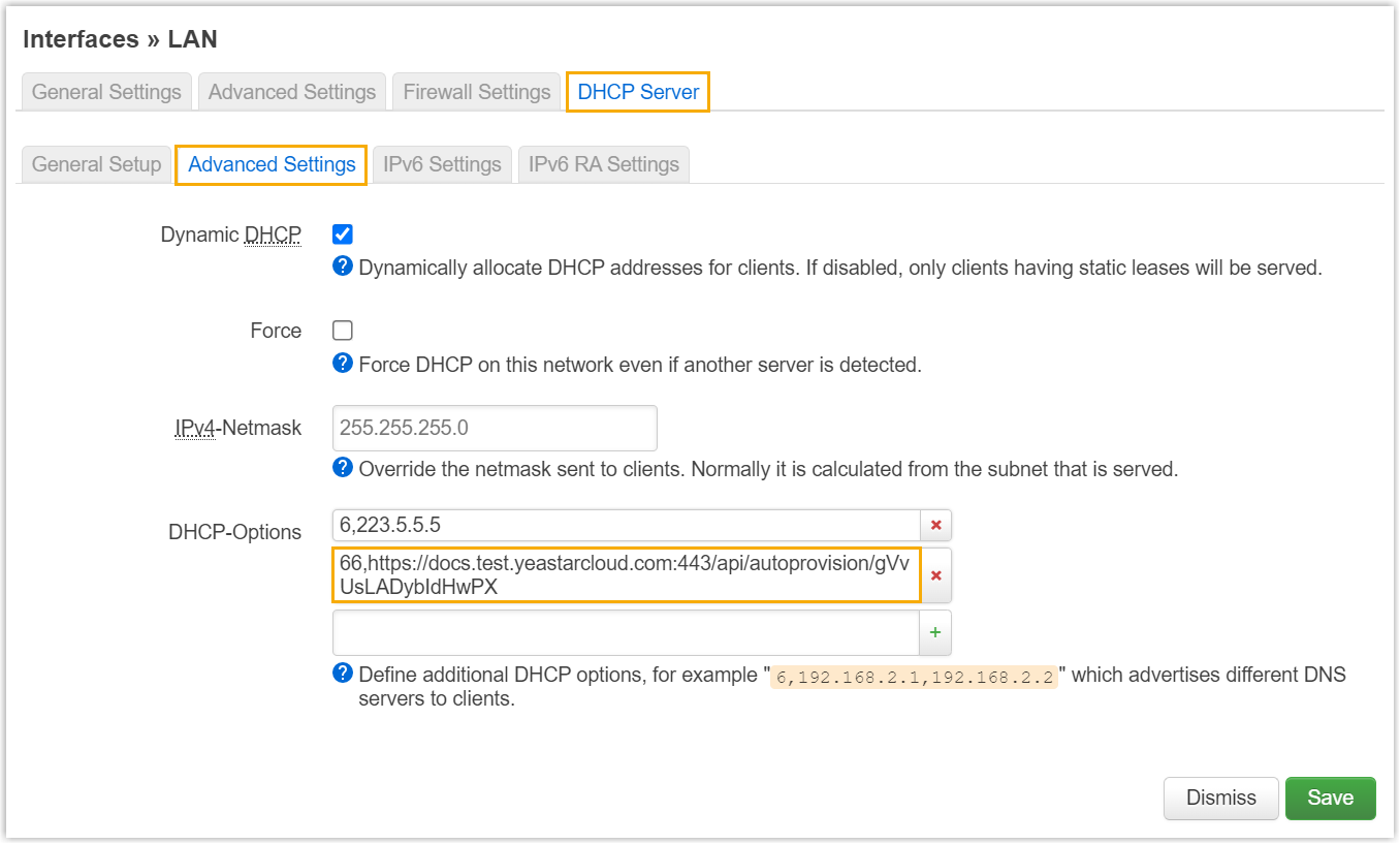 - In the subnet where the IP phone is deployed, use the generated provisioning link to configure option 66 on the DHCP Server.