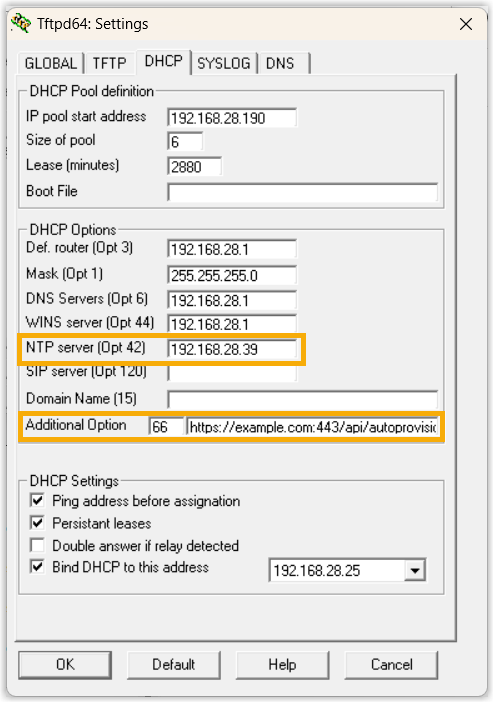 On the DHCP server, configure DHCP option 66 with the provisioning link obtained from the PBX.