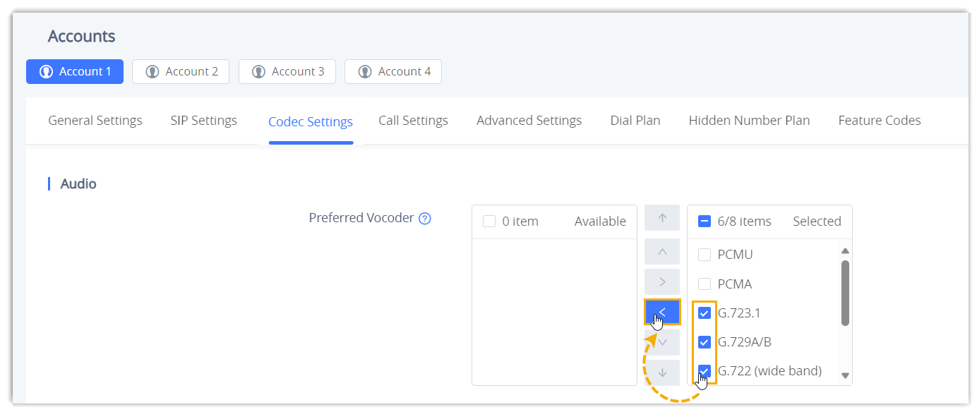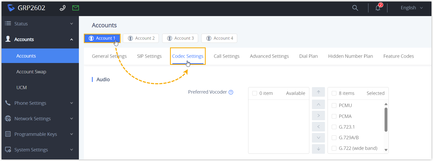 By default, Grandstream IP phone enables all available codecs for its accounts, which may lead to issues with outgoing calls. Therefore, it is recommended to remove unnecessary codecs for the account that has been registered with the PBX extension.