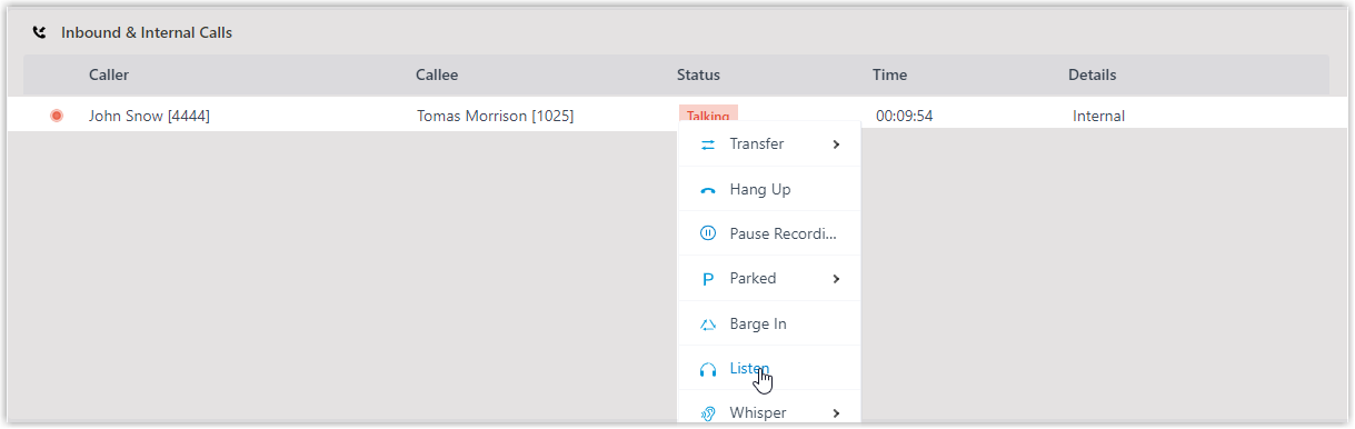 - On the Inbound & Internal Calls panel or Outbound Calls panel, hover your mouse over an active call.