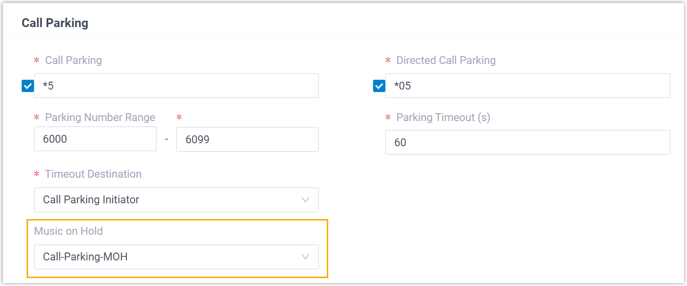 Call Parking Allows you to customize music on hold for call parking, which is played to the other party when the call is parked (Path: ).
