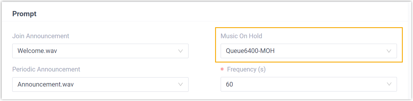 Ring Group Allows you to customize the following prompt and music on hold for a ring group (Path: ).