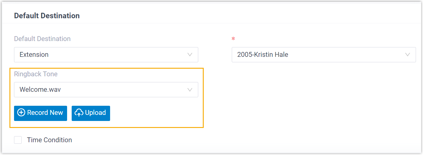Inbound Route Allows you to set Ringback Tone when the destination of an inbound route is set to Extension, which is played to callers before the extension user answers the call (Path: ).