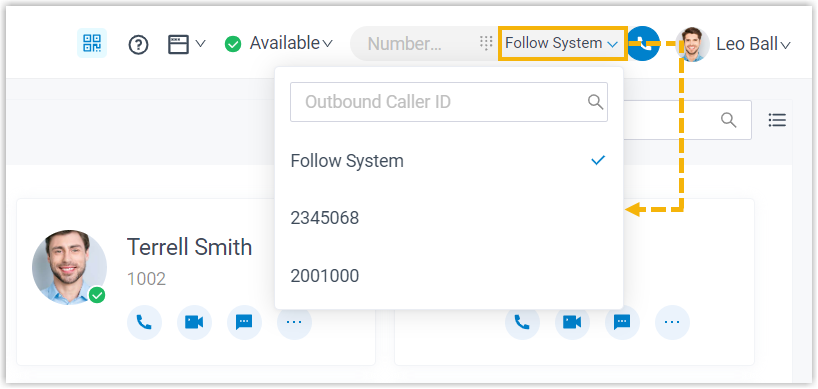 Note: To achieve this, you need to associate outbound caller ID with extensions and assign them the Allow Selecting Outbound Caller ID permission (Path: ).For more information, see Select Outbound Caller ID (DOD) to Call.