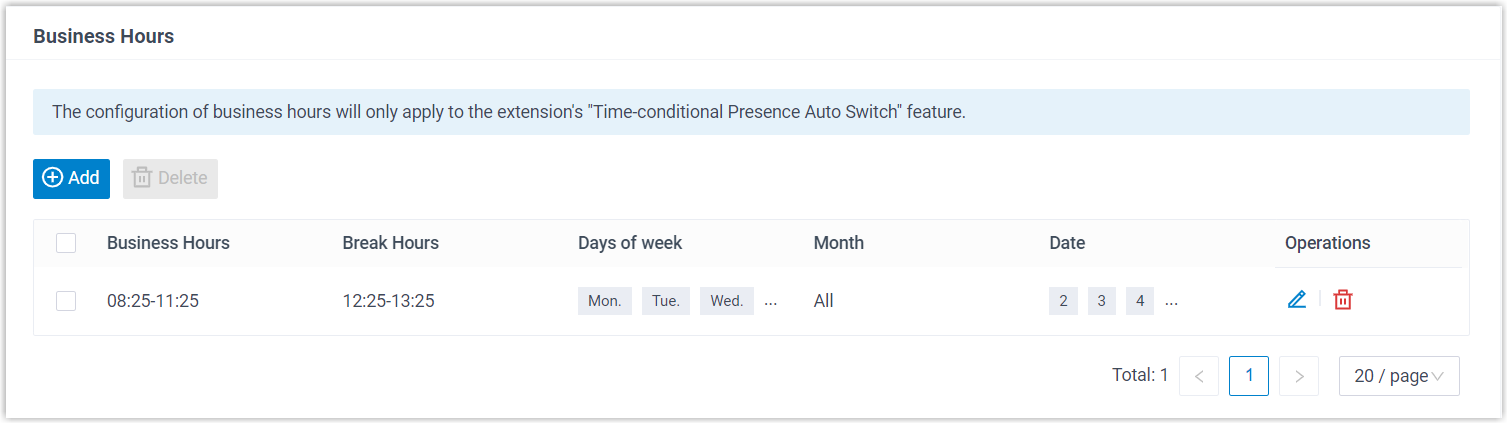 switches presence based on business hours and holidays.Note: This setting is available only when system administrator has configured custom business hours for the extension.