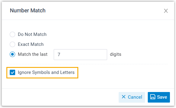 When enabled, the system will automatically ignore all symbols and letters in numbers during contact matching, using only numeric characters (0-9) for improved accuracy.